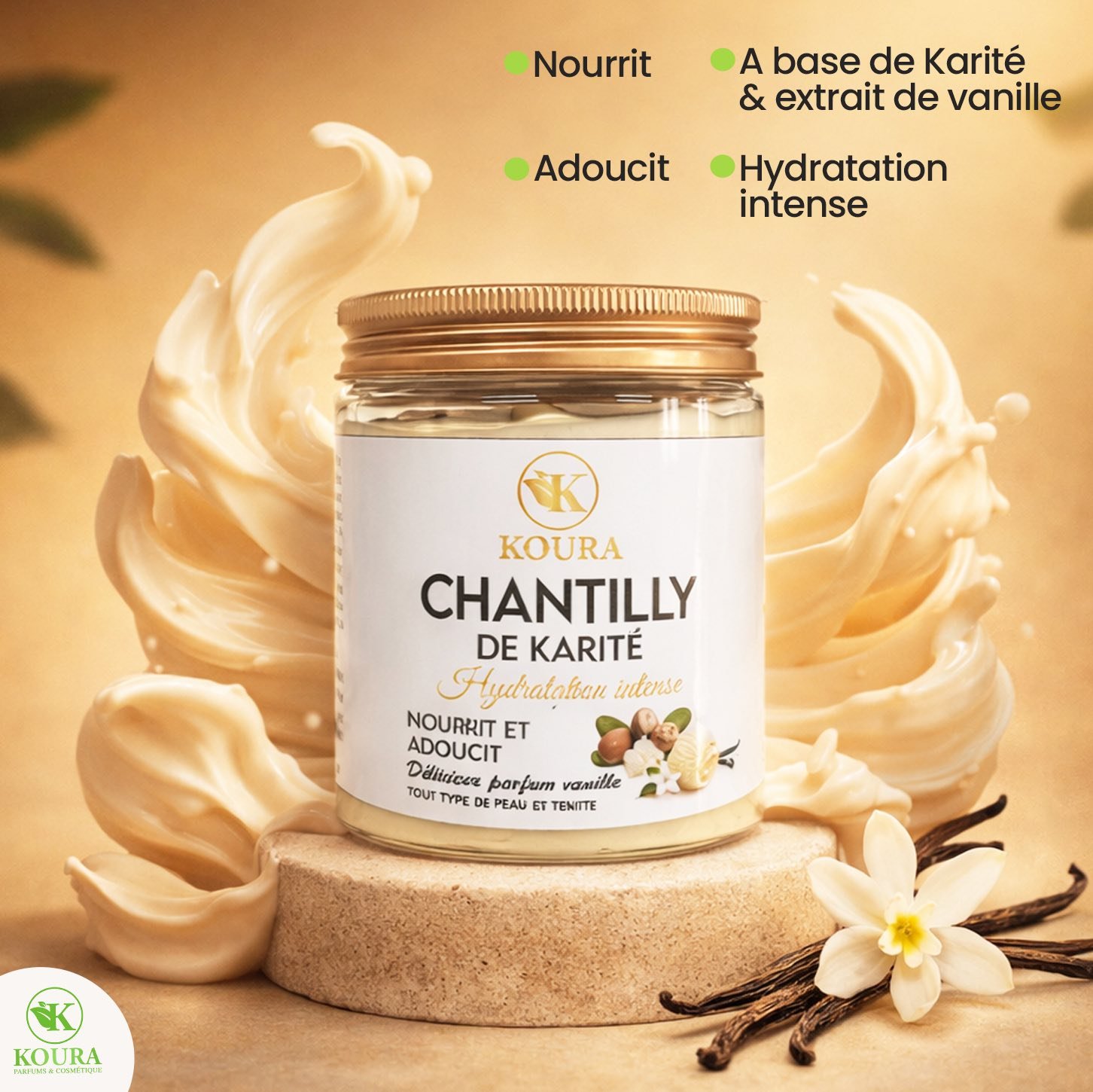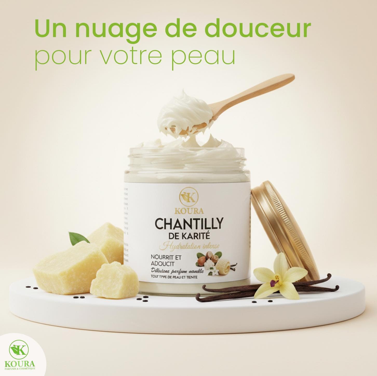 Offrez à votre peau un véritable nuage de douceur avec la Chantilly de Karité KOURA, une crème fouettée riche et onctueuse, conçue pour nourrir, adoucir et hydrater intensément la peau au quotidien.